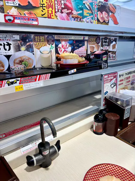 One great thing about all these sushi chains is that green tea powder is free at every table. Simply grab a cup, add the powdered tea, and use the hot water dispenser on the table to make your own tea. Additionally, there is a self-service cold water station located separately from the tables, and that’s also free!